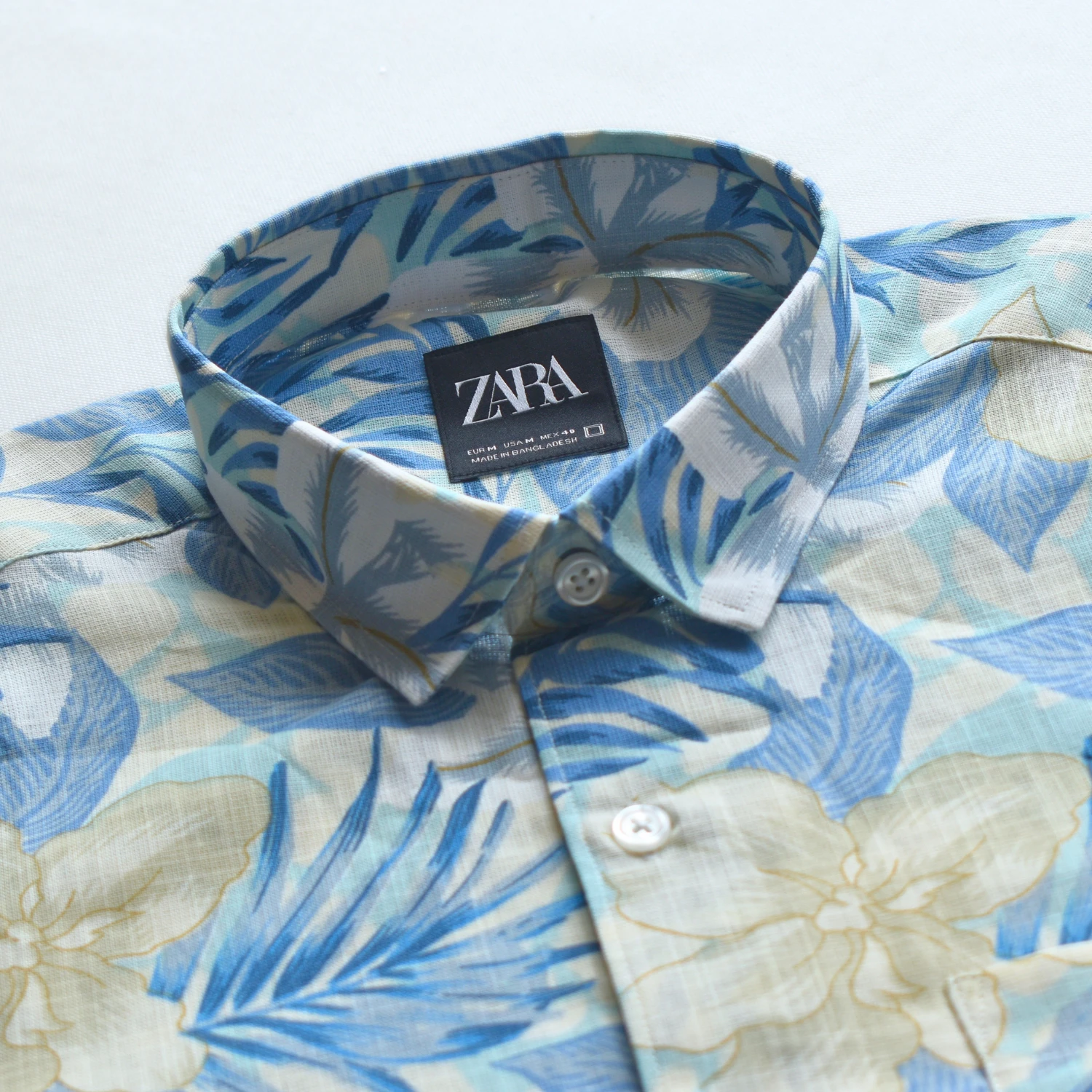 The tropical blue print delivers a clean and calming aesthetic, while the lightweight fabric ensures all-day ease. Designed with a functional chest pocket and a modern round hem, this shirt is perfect for both casual outings and relaxed occasions. Wear it tucked or untucked, it adapts effortlessly to your style.