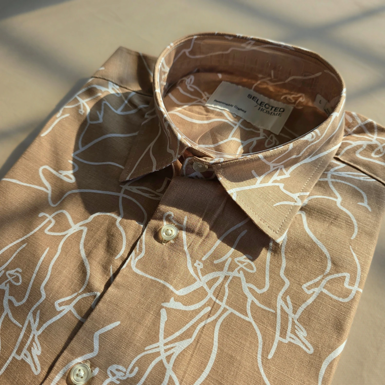 Add a modern artistic edge to your summer wardrobe with this brown abstract line print shirt, crafted from 100% premium cotton for superior comfort and breathability. The lightweight fabric ensures a soft and airy feel, keeping you cool throughout the day. Featuring a unique minimal line-art pattern on an earthy brown base, this shirt stands out with subtle sophistication. Designed with half sleeves, a clean no-pocket front, and a contemporary round-cut bottom, it perfectly blends casual comfort with modern style. Ideal for everyday wear, casual outings, or creative styling, this shirt lets you express effortless individuality.